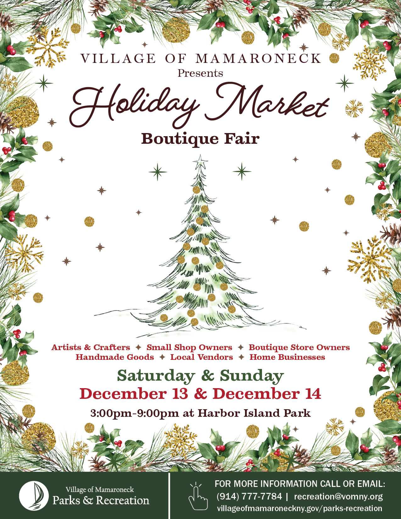 The Village of Mamaroneck Parks & Recreation Department is excited to welcome the community to our Holiday Market – Boutique Fair, taking place during a festive winter weekend at Harbor Island Park.